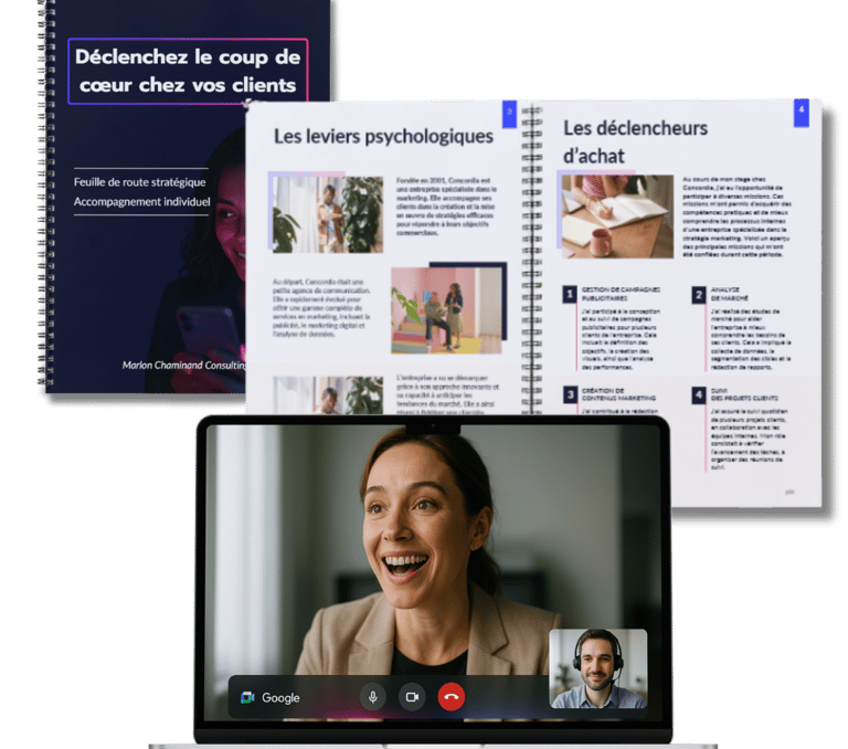 A la fin de cet accompagnement, vous repartez avec un plan détaillé pour avoir un positionnement clair, une offre différenciante et un message percutant, conçu pour séduire vos clients dès les premiers mots.